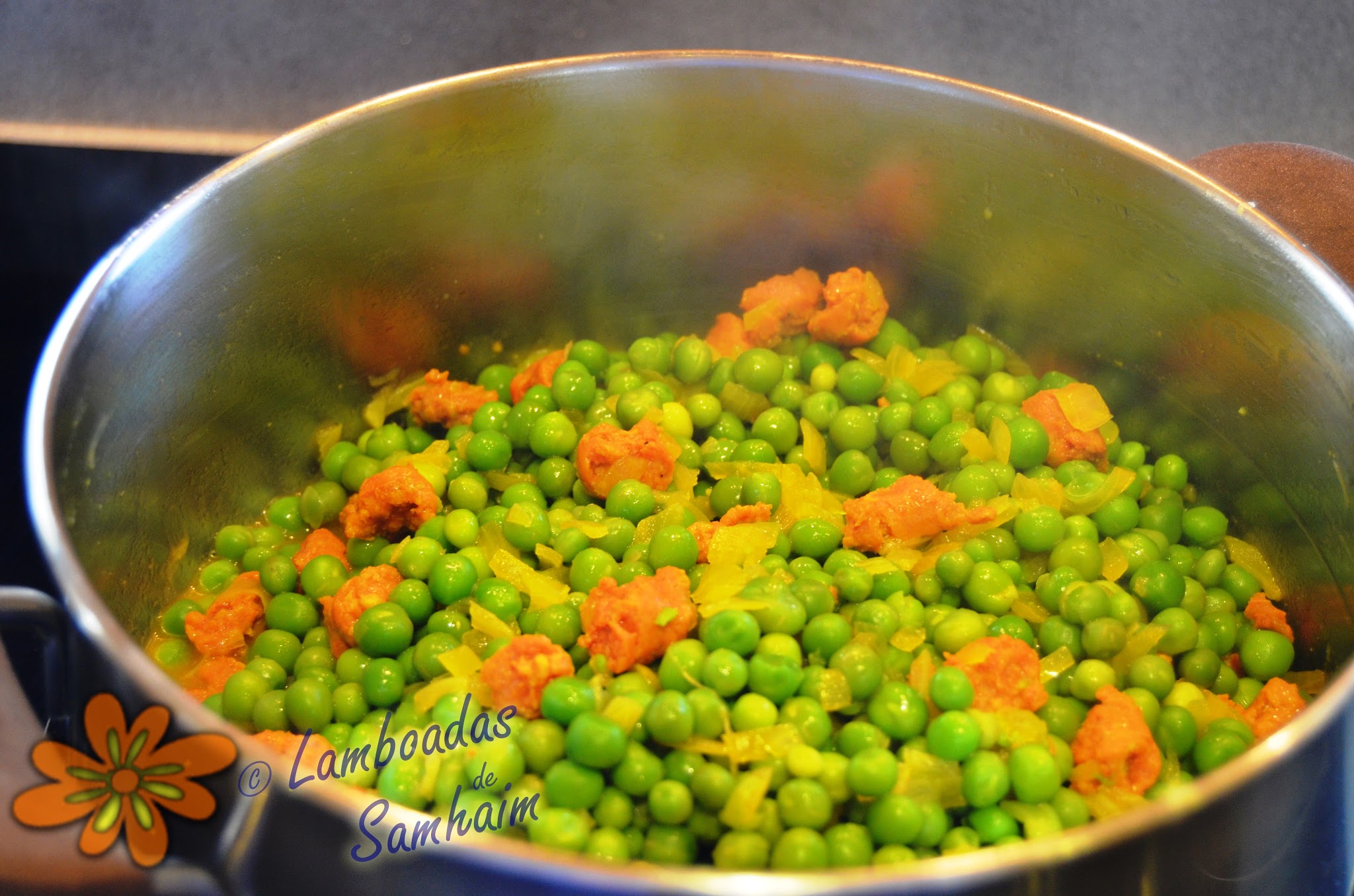 Escurrimos los guisantes y los volvemos a poner en el mismo caldero, donde añadimos la cebolla y la salchicha acompañados de un vaso de vino blanco; dejamos que cueza todo junto hasta que se evapore el vino.